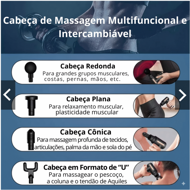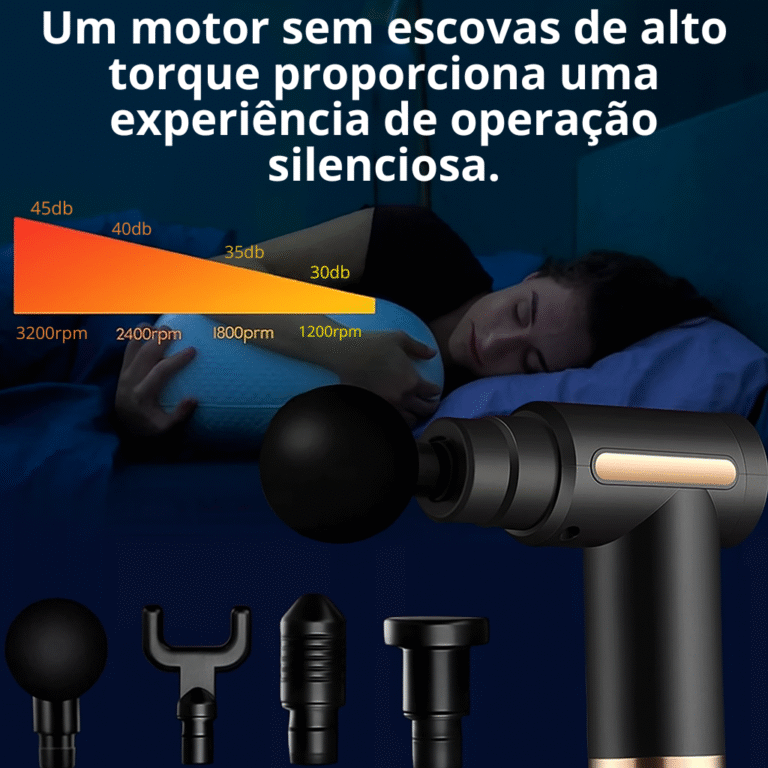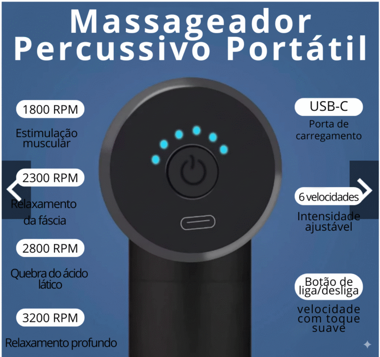 A pistola massageadora é um aparelho portátil que utiliza a terapia de percussão para aplicar impactos rápidos e concentrados nos tecidos musculares.